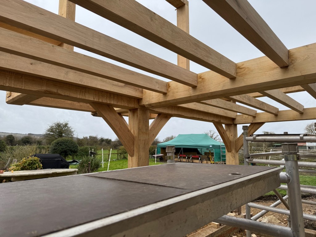 Progression of the new single storey rear extension with an existing thatched roof is well under way. The extension is constructed using timber framing with carefully constructed and beautiful joinery.