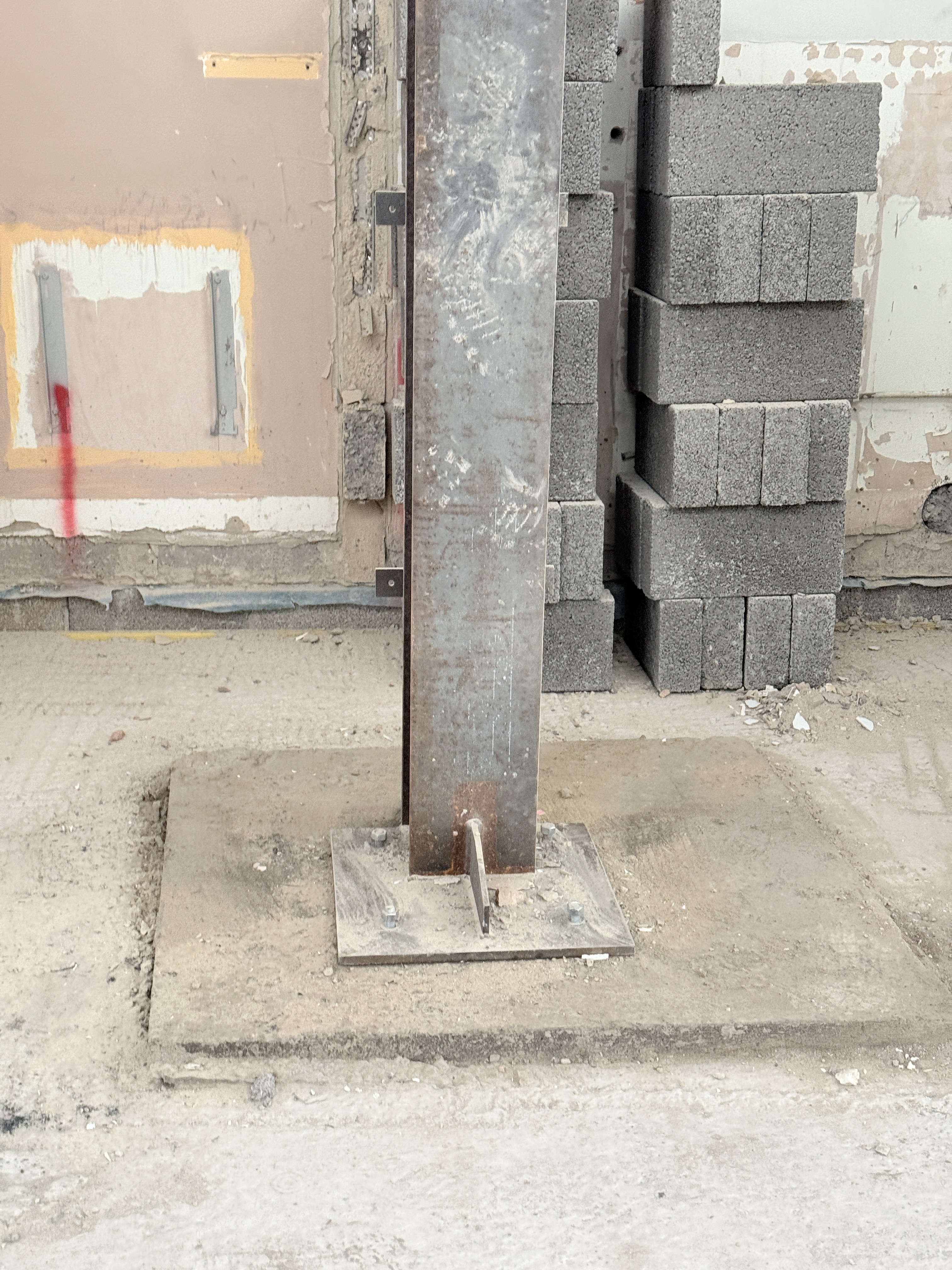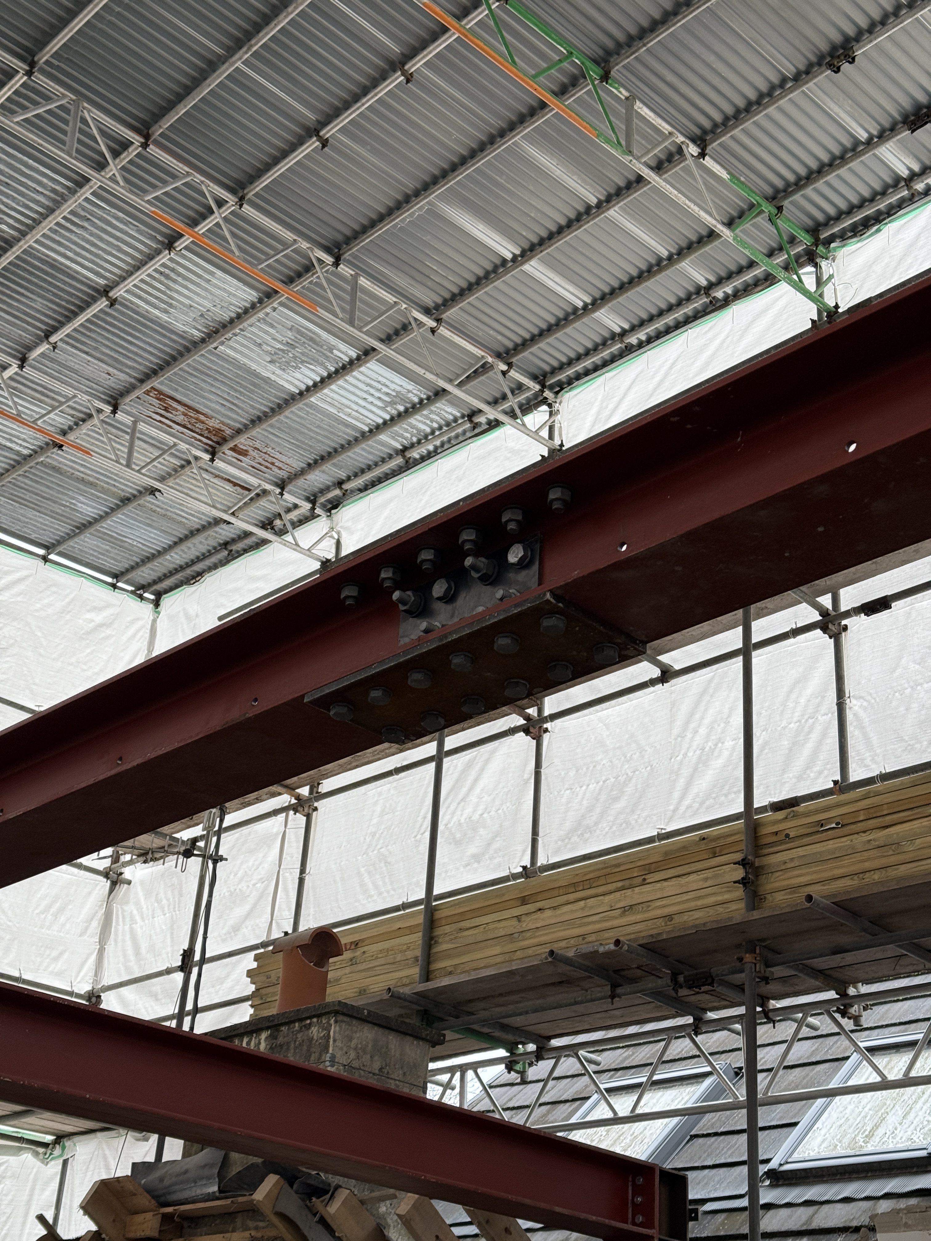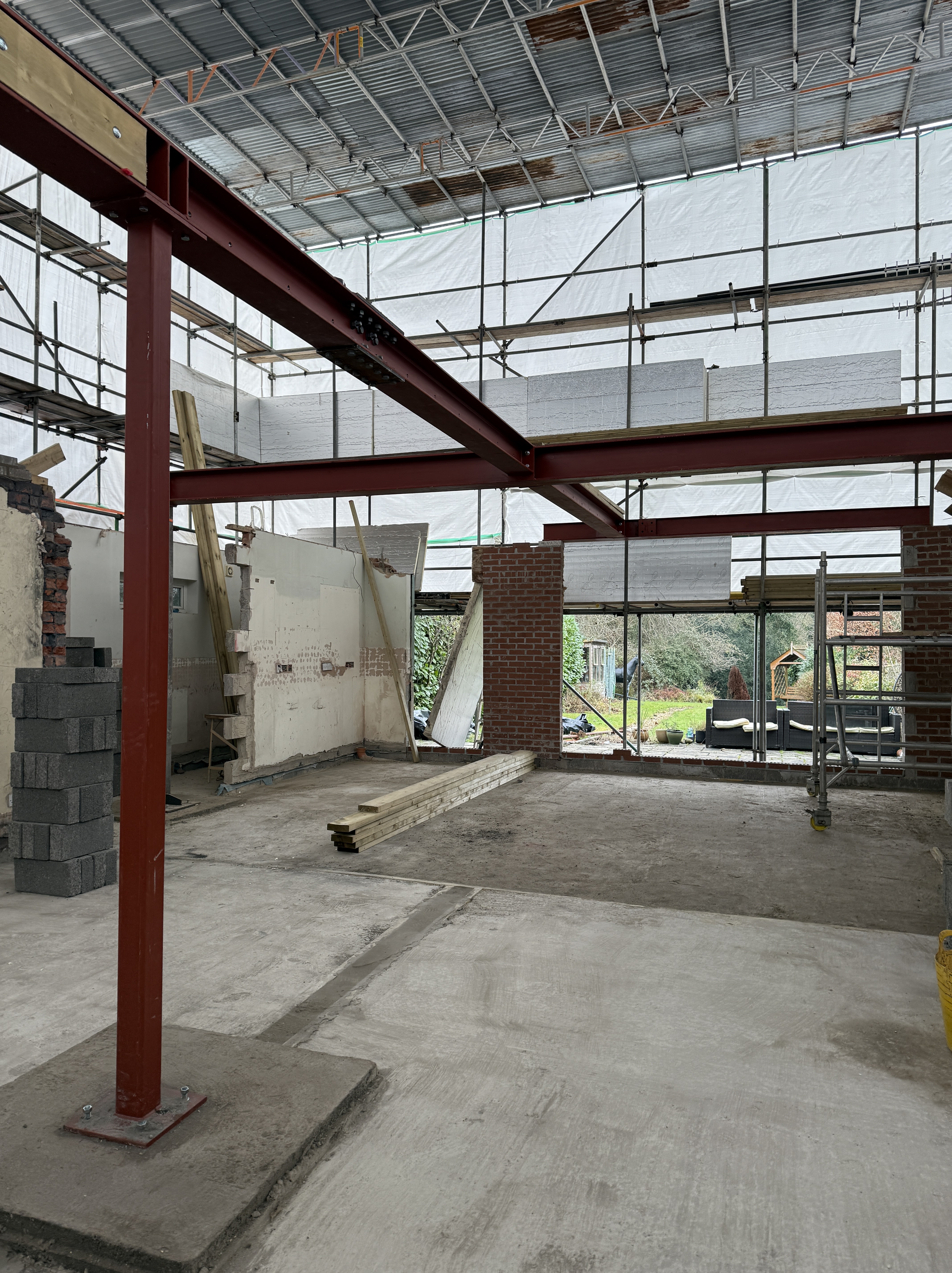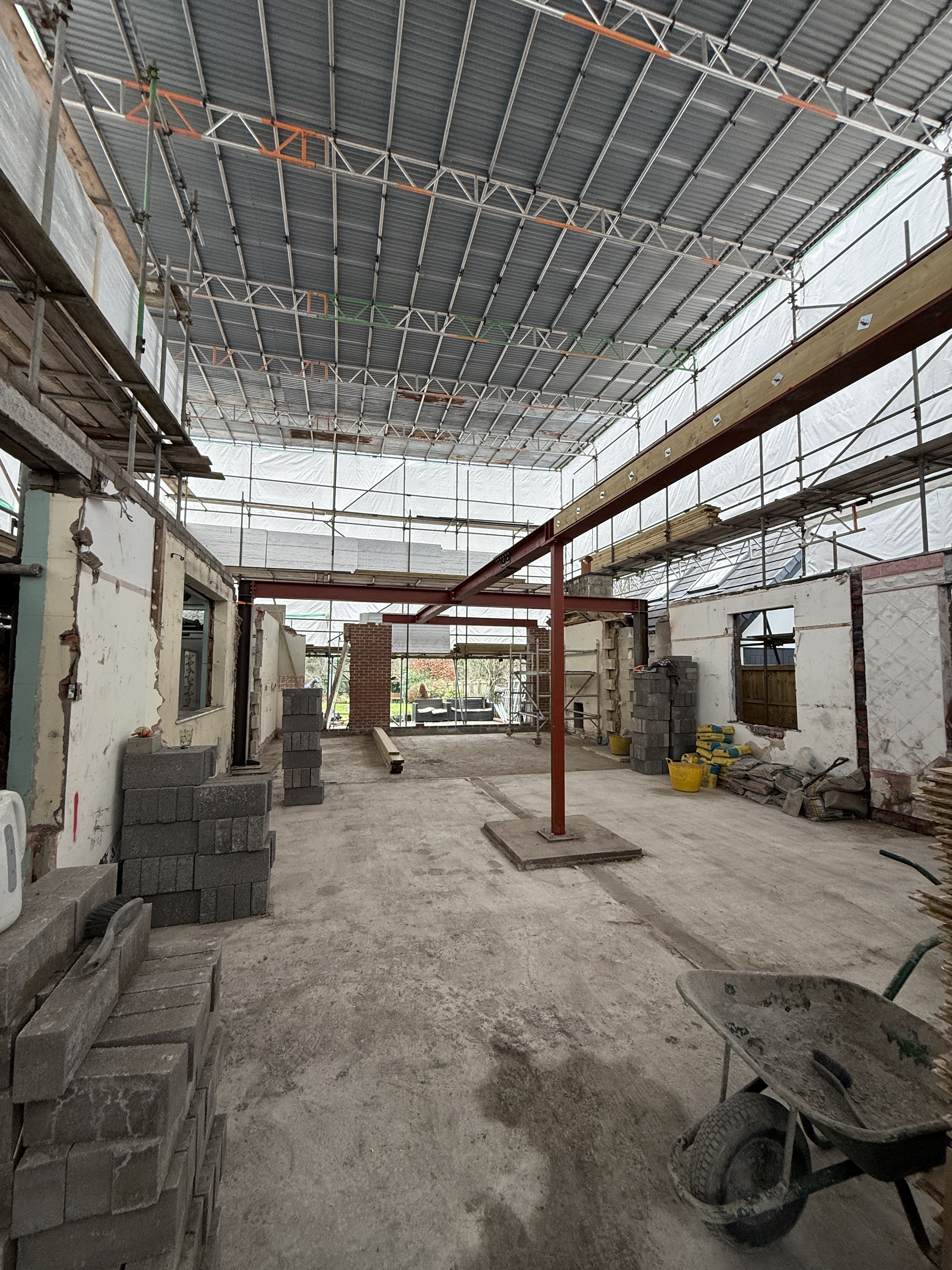An existing bungalow has had the majority of its internal walls stripped to form a new arrangement internally. The existing roof level is to be increased with a new vaulted roof which is to be formed using cranked steel frames. A new central steel spine has been constructed to support the joists and roof structure.